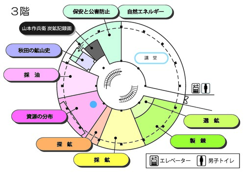 3階は、「資源開発」についての展示です。 資源の開発技術は、多岐にわたっていますので、当館では、資源開発の流れを「探鉱」→「採鉱・採油」→「選鉱」→「製錬」の4つの工程に分類し、鉱物の探査から金属の製造まで、それぞれを独立したコーナーとして展示しています。この他にも、「鉱物資源の分布」「鉱山の保安技術」「自然エネルギー」「秋田の鉱山史」など、3階には全部で9つのコーナーを設け、鉱山技術の全容とその変遷が学べるようになっています。 鉱業博物館では,鉱山設備の模型を多数展示しており,館の特色のひとつになっています。通常、鉱山設備は巨大で地下にあるものも多く、その全貌を把握することは難しいことです。そこで、それらを模型にして展示することで、地下の状態や機械の内部構造など、通常見えないものや把握しにくいものも理解し易くなります。鉱山模型コレクションの中には、近代化過渡期の技術を伝える歴史的価値を備えたものも多数あります。これらすべてが特別につくられた唯一無二の作品であり、精緻な模型を眺めるだけでも楽しむことができるでしょう。